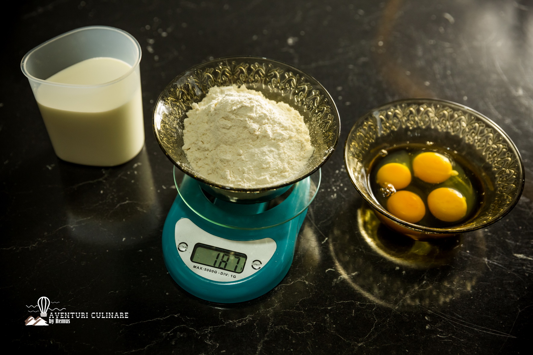 • cântăresc cantitatea de ou și pun exact aceeași cantitate de făină, iar lapte de 2 ori mai mult;