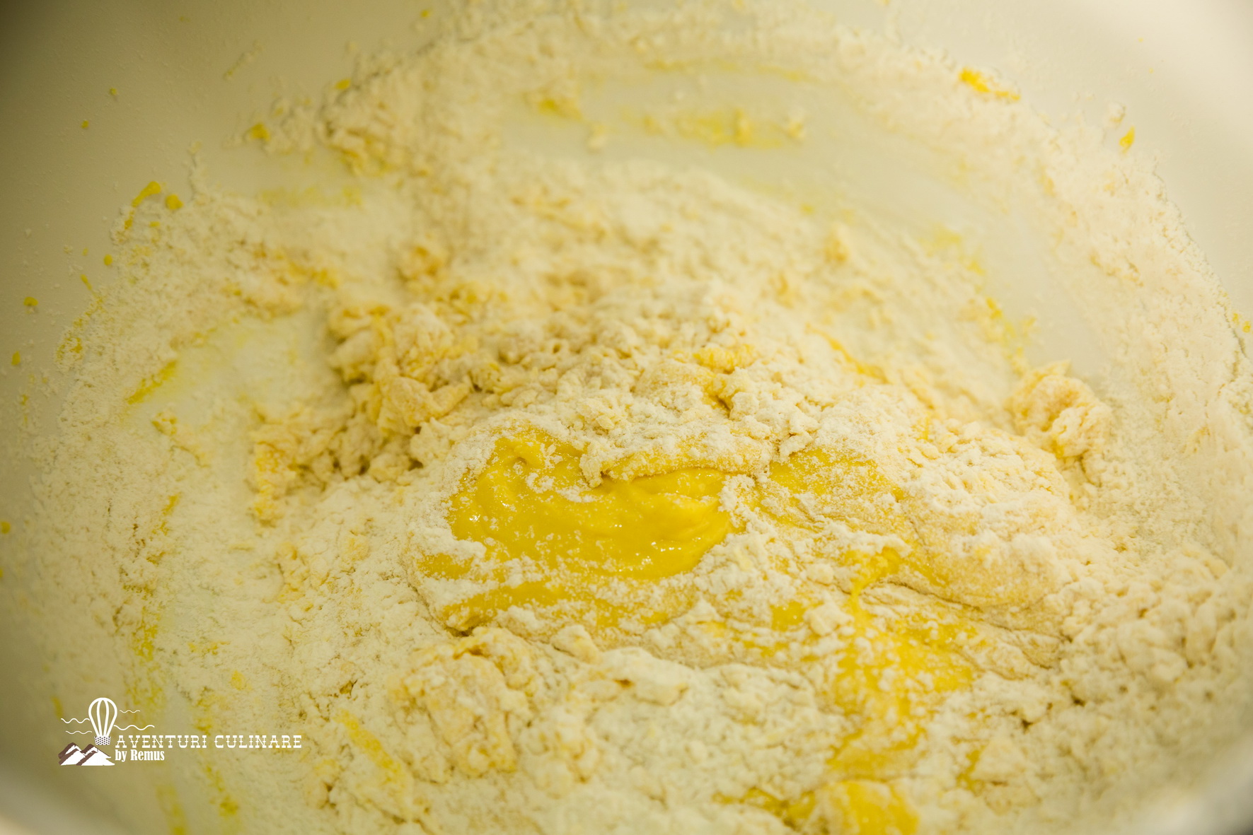 Amestec astfel încât să încorporez făina. De obicei folosesc un mixer, e mai rapid; se poate amesteca și cu telul.