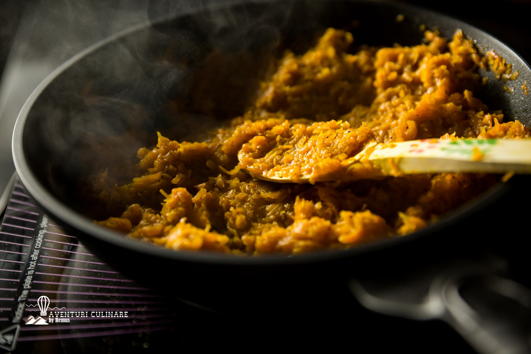 Topesc untul în tigaie și apoi adaug dovleacul (curățat și ras). Peste dovleac pun zahărul, piperul, scorțișoara și amestec în continuu să nu se lipească. Călesc până devine aproape o pastă.