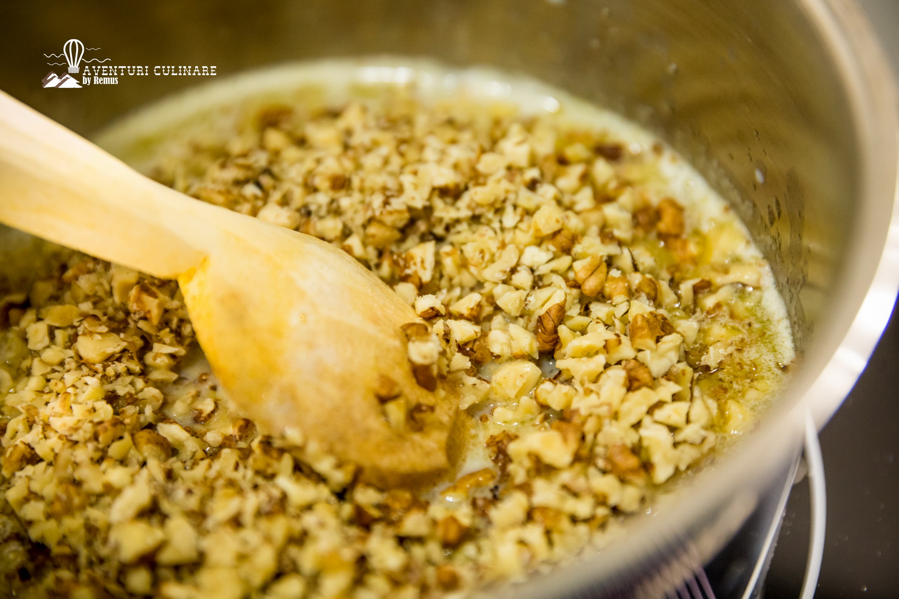 Pun restul de lapte, zahărul și untul într-o crăticioară, pe foc mic. Când s-a topit untul, adaug rahatul, stafidele, curmalele și nuca.
