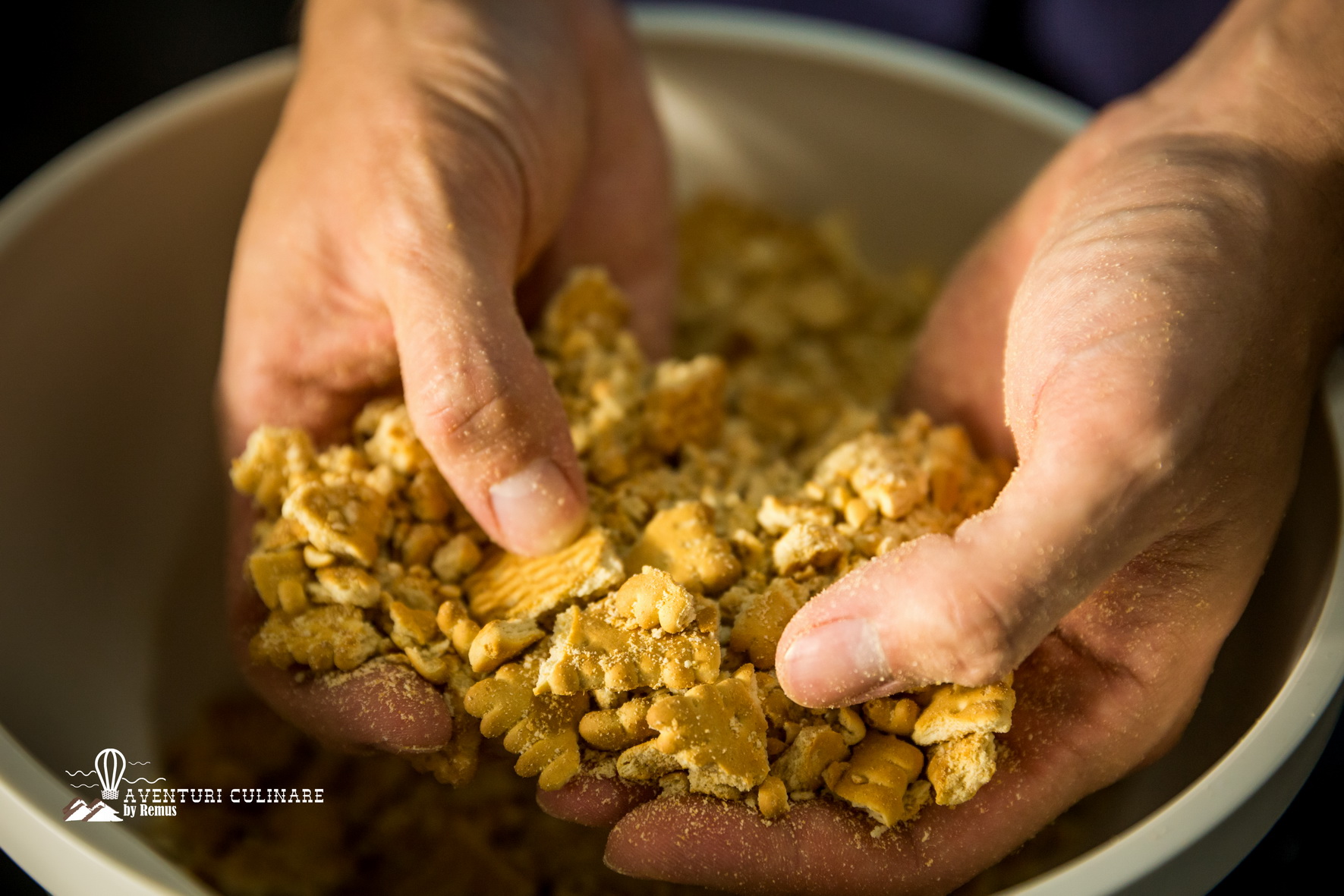 Apoi tai rahatul, curmalele și nucile și zdrobesc biscuiții în bucăți cât mai neuniforme (dar nu foarte mari).