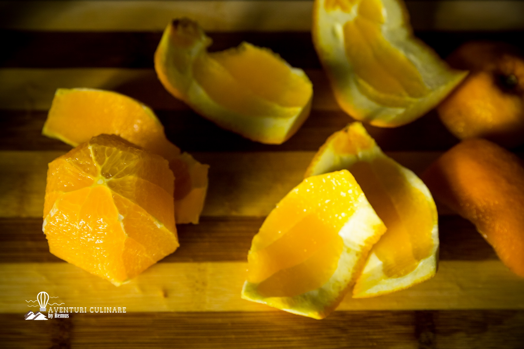 - Fructe la alegere, în funcție de preferințele fiecăruia (sau ce are acasă). Noi folosim de obicei portocale, mandarine, mere, gutui (din compot de gutui), ananas (conservă sau proaspăt, dar mai mult din conservă
