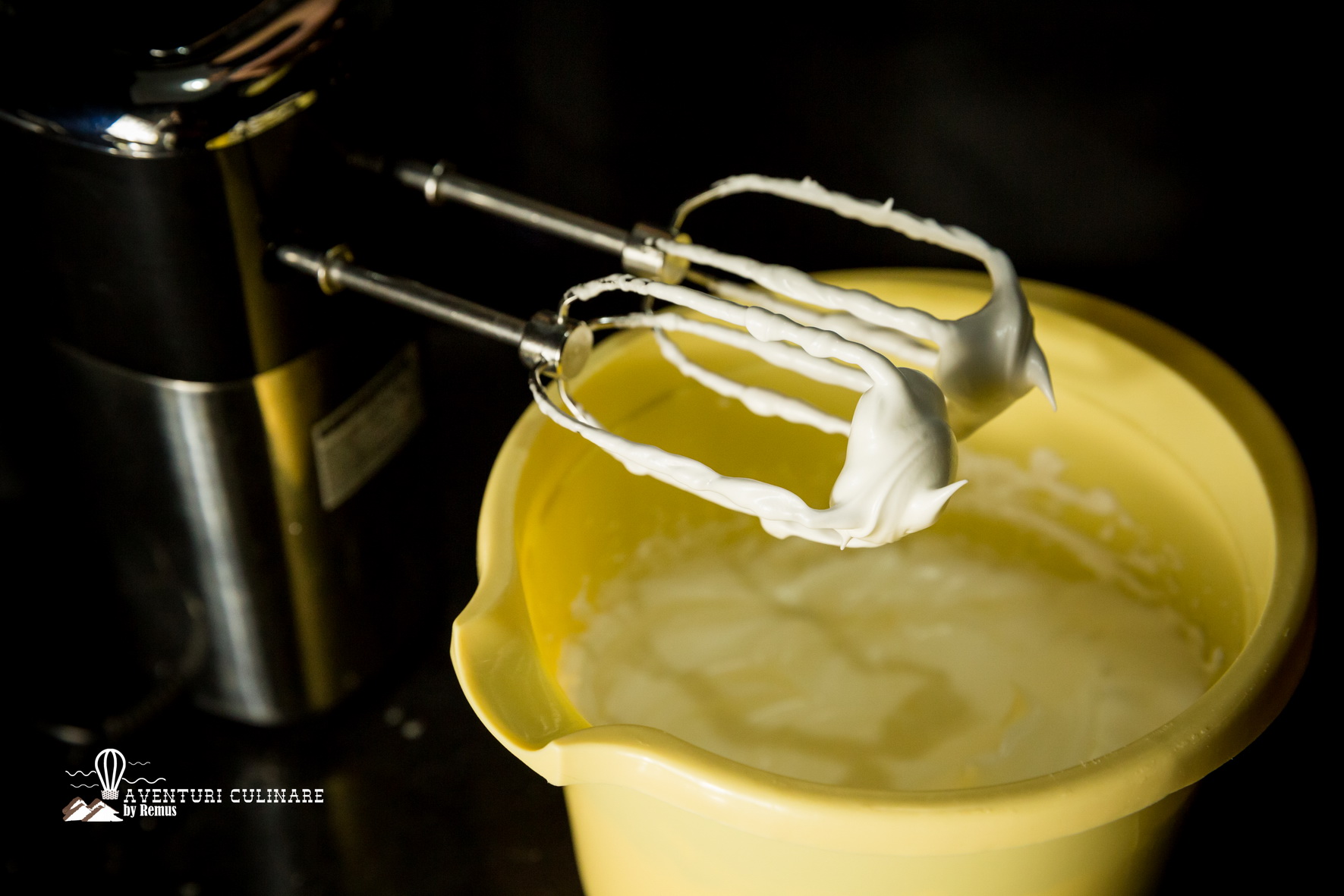 Separat prepar frișca. Încep să mixez la viteză mică până se îngroașă puțin (altfel frișca poate sări din vas). Apoi cresc treptat viteza, până când se întărește. Atenție, frișca nu se bate excesiv de mult!
