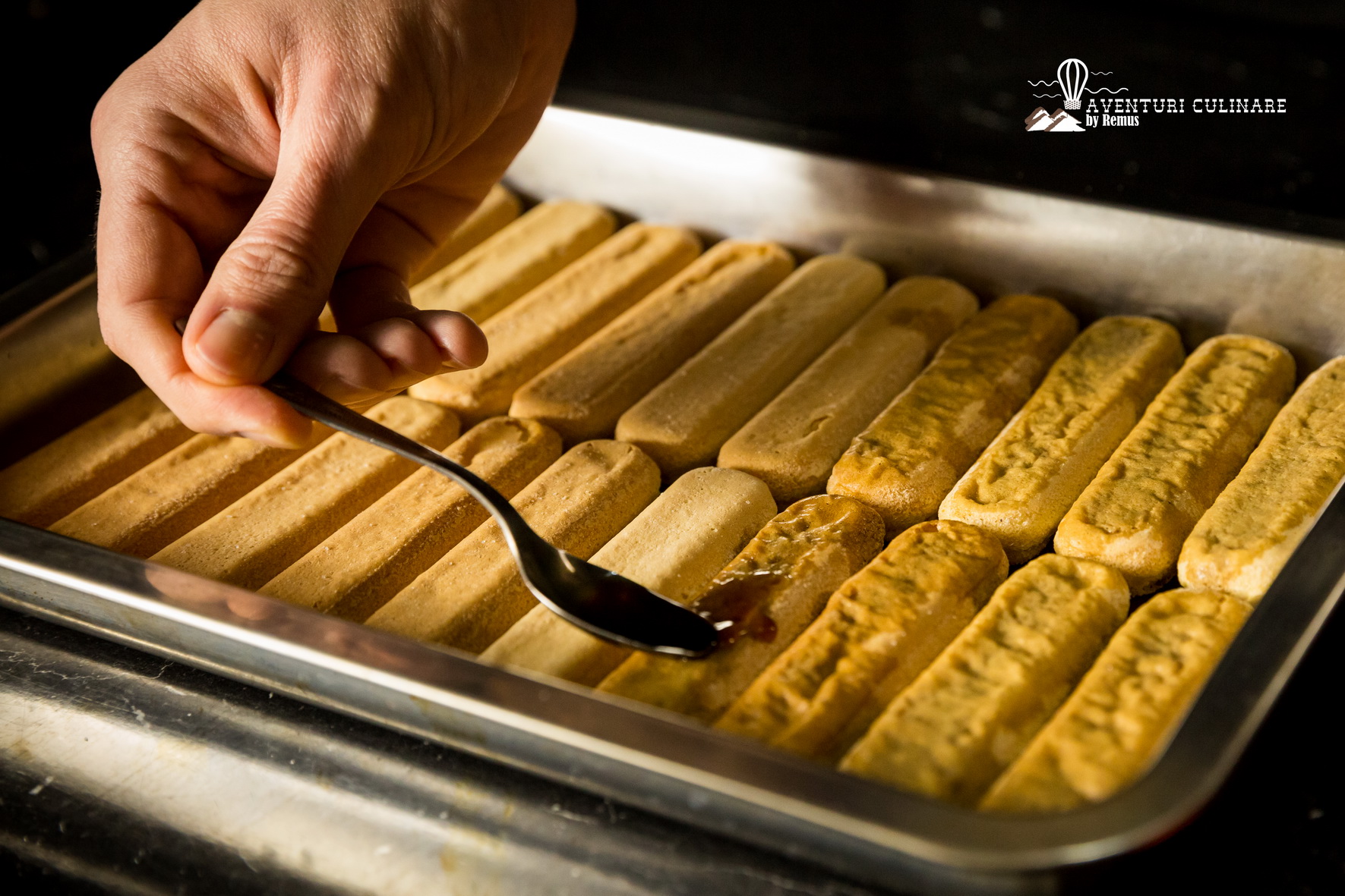 Într-o tavă (20×30 cm) așez un rând de pișcoturi. Nouă ne-au încăput perfect 20 de bucăți.