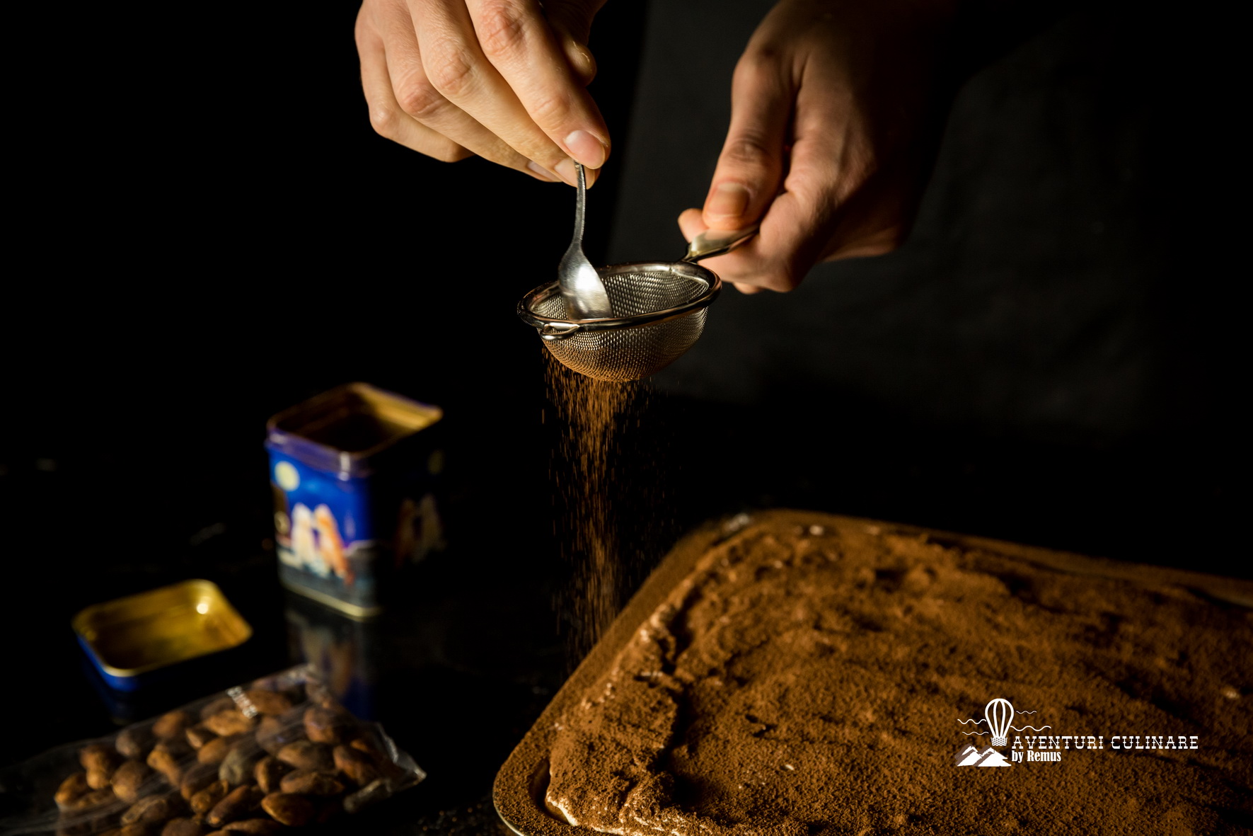 Înainte de servire, îndepărtez folia și pudrez cu cacao pe toată suprafața. Eu mă ajut de o sită.
